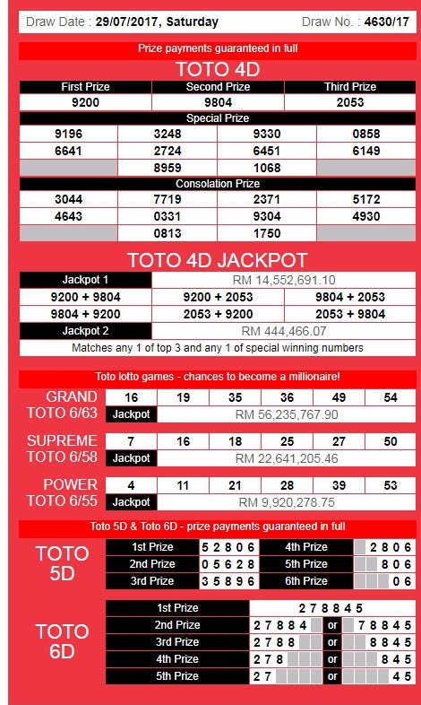 Sgp45toto - Singapore Pools Legal Lottery. 1st Prize: 9182: 2nd Prize: 8381: 3rd Prize: 1458: Starter Prize: 5048: 9563: 5448: 0577: 1562 See the latest TOTO results here every Monday and Thursday evening. Analyse Singapore Pools's TOTO lottery result trends & statistics since 15 weeks ago.. Home; Lottery. 4D TOTO. Blog; About; Contact; Login; Thursday, 4 May 2023 TOTO Results Singapore Pools by GIDApp. TOTO Results . Thursday, 4 May, 2023. 25 26 31 37 45 49: 5: 04 06 15 22.